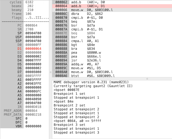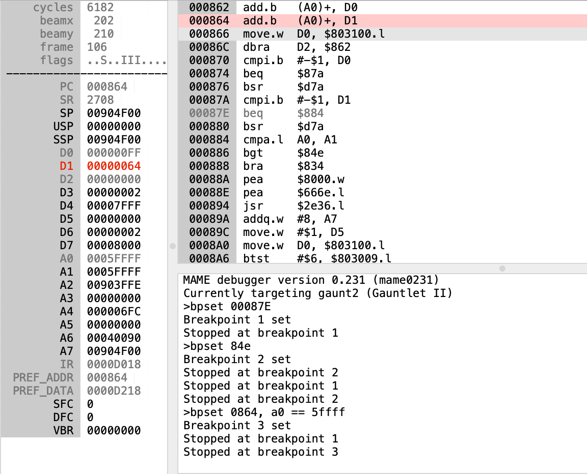 I am impressed at the accuracy of the bug description; everything I encountered confirmed the game behaves exactly as stated in the report. The issue was also easier to solve than I anticipated, thanks to the robust debugging tools within MAME. I was also lucky that I wasn't forced into making any changes that modified instruction offsets, as that would have added complexity. The fix can be described by altering just 3 bytes in ROM "136043-1122.6b"