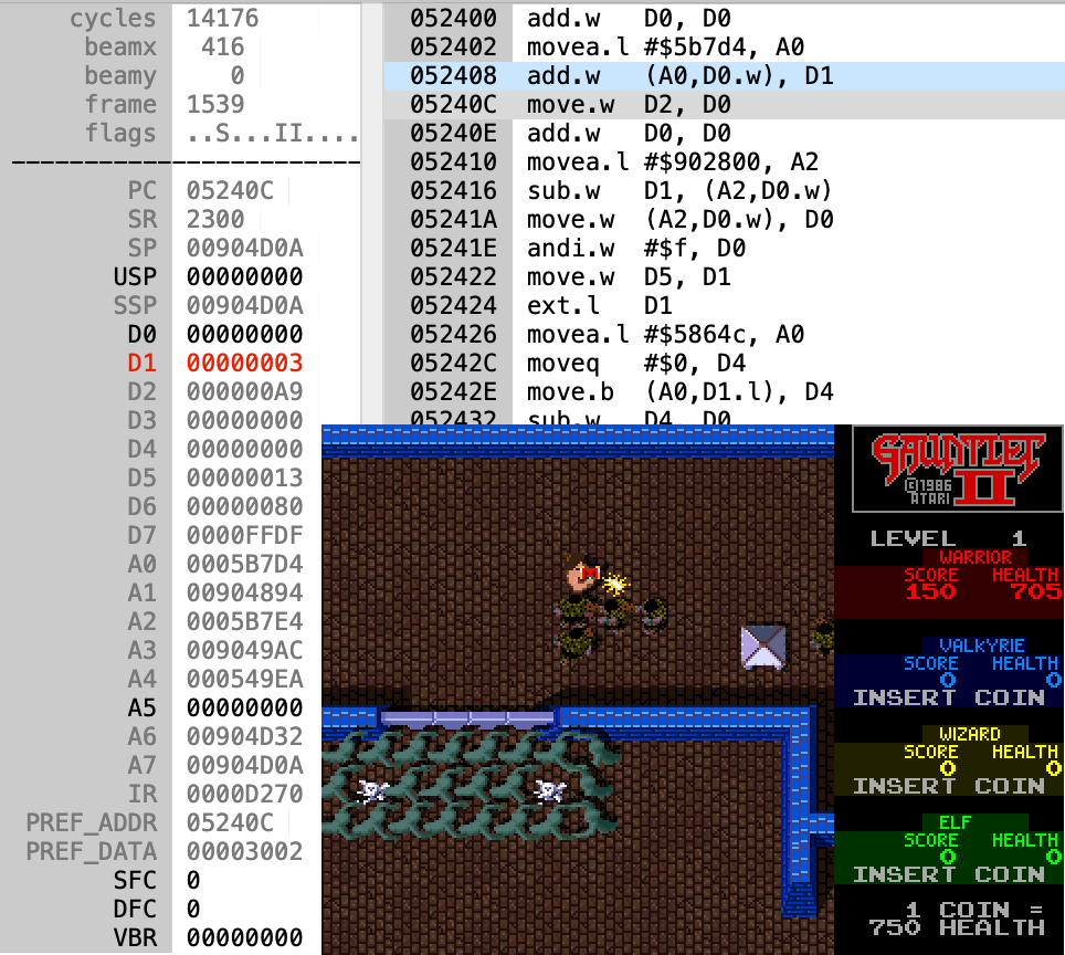 D0 00000000 D1 00000030 D2 00000138 D3 00000018 A0 00902000 A1 00058A4A A3 009049A4 A4 009048E8 | 04AC10 move.w (A3,D0.w), D1 # D1 = *(A3 + D0) 04AC14 move.w (A4,D0.w), D3 # D3 = *(A4 + D0) 04AC18 lsl.w #3, D3 # D3 = D3 * 8 04AC1A add.w D3, D1 # D1 = D3 + D1 04AC1C add.w D1, D1 # D1 = D1 + D1 04AC1E lea $58a4a.l, A1 # A1 = 00058a4a (program ROM) 04AC24 lea $902000.l, A0 # A0 = 00902000 (MOB base) *04AC2A move.w (A1,D1.w), (A0,D2.w) # *(A0 + D2) = *(A1 + D1) |