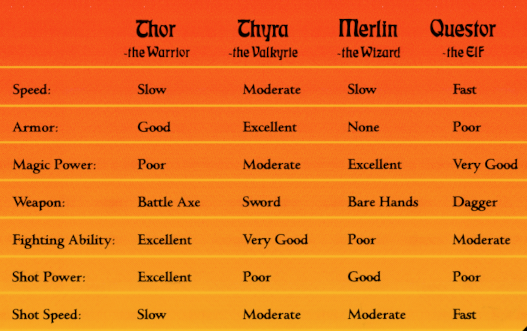 One of the major gameplay changes in Gauntlet II from the original Gauntlet is that each player has the ability to change the character assigned to a coin slot. In Gauntlet, the characters are fixed to each coin slot, so there is only red warrior (Thor), blue valkyrie (Thyra), yellow wizard (Merlin), and green elf (Questor). In Gauntlet II, the colors are still assigned to fixed coin slots, but you can have a red wizard, blue warrior, yellow elf, green valkyrie, and so on.