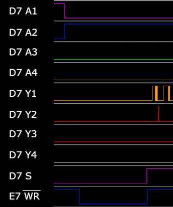 When S is low, the Y outputs should match the A inputs. The captured data showed that during the write operation to E7, S was low, A2 was high, but Y2 remained low.