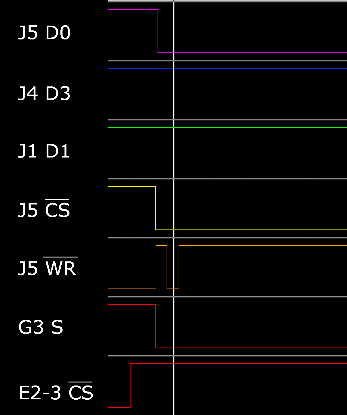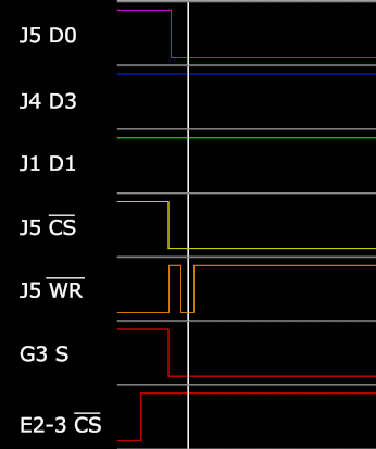 That capture, as expected, showed that 0xff was being written to J1 and J4 when it should have been 0xD7. However, the controlling signals all looked correct, so I still had no leads as to the root cause of the issue. At this point I was running out of ideas, but then I realized this behavior could also be caused if the CS signal for E2-3 was timed incorrectly, so I added that signal and re ran the capture.
